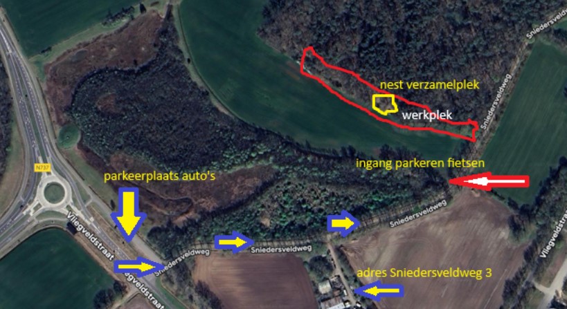 Op onderstaand kaartje is aan gegeven waar de werkplek precies ligt. Kom je met de auto? Parkeer deze dan langs de vliegveldstraat op de parkeerplaats en loop het laatste stukje naar de werkplek. Fietsen kunnen direct bij de werkplek worden neergezet.