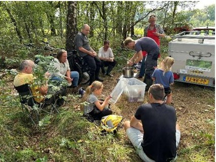 Voor het wat minder gladde terrein gebruikten we nog wel een kruiwagen. Het doel hiervan is om het terrein voedselarmer te maken waardoor hier uiteindelijk ook heide en aanverwante begroeiing zal gaan ontstaan. Het tempo zat er al vlot in. Na de pauze kwam boer Koort en zijn vrouw Pytsje met hun zoontje nog langs met voor ieder een zelfgebakken lekkernij die zeer goed smaakte. Nadat we al het maaisel van het veld verwijderd hadden, pakten we om half één onze materialen bij elkaar en vertrokken we weer naar de ingang van het terrein.